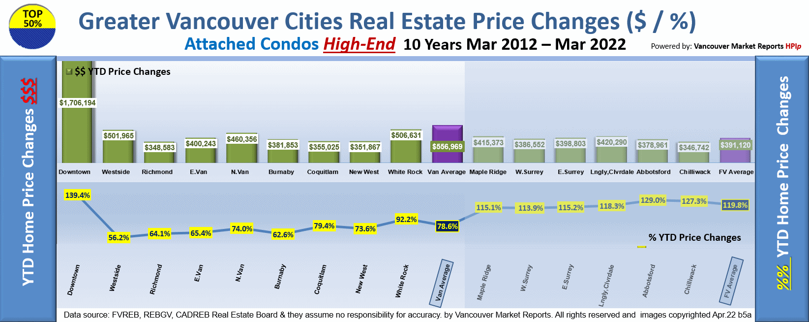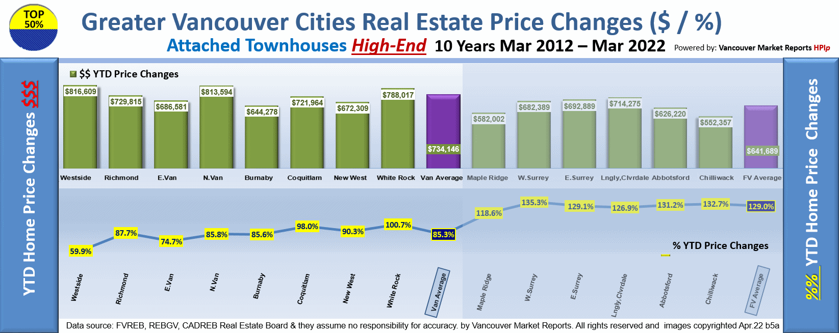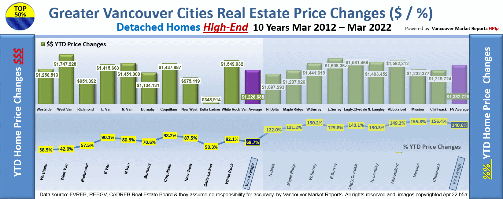 Here on the first Graph the Year to Date for the Top 50% Single Family Housing Market comparing all cities in the Greater Vancouver areas is up an AVERAGE of 82% with White Rock setting the second price increase record, West Vancouver being the highest.