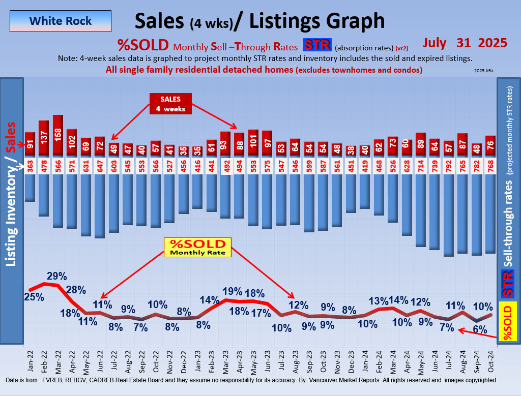 Current:  White Rock South Surrey is in a Buyer market with average listing inventories, 6 %SOLD rates and a 94% Sell/List Ratio.